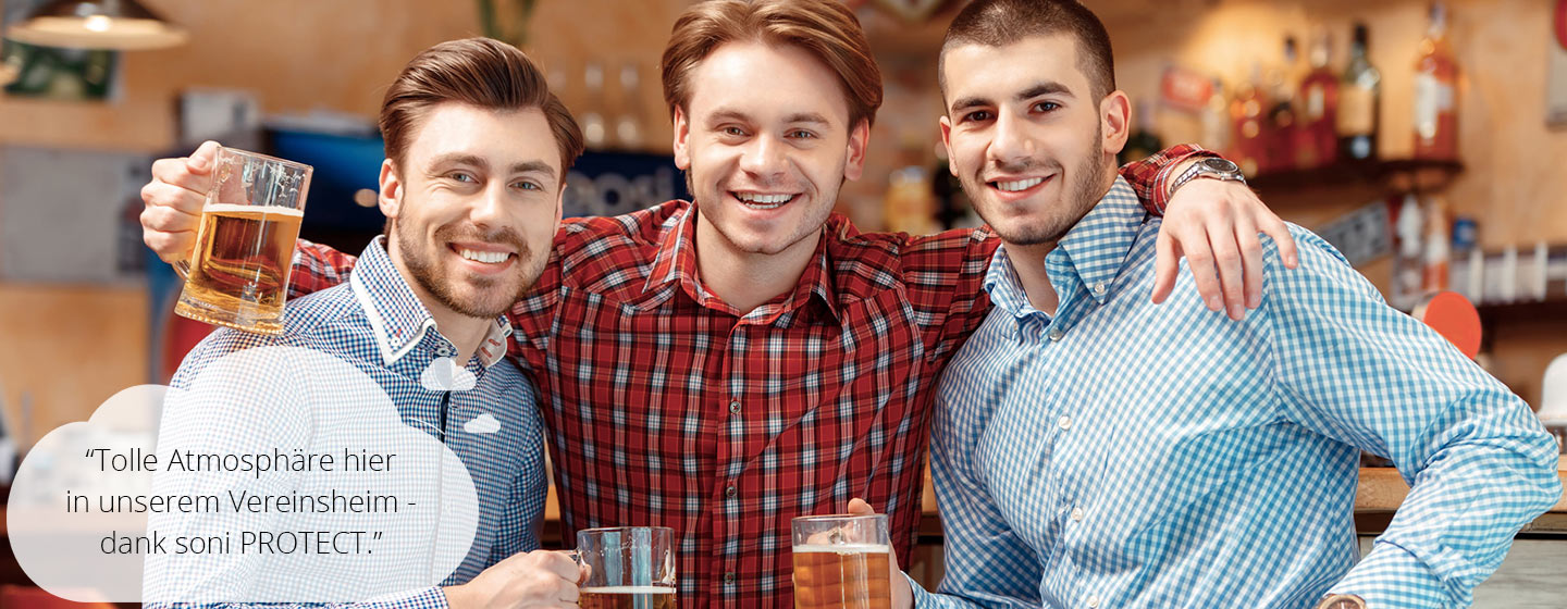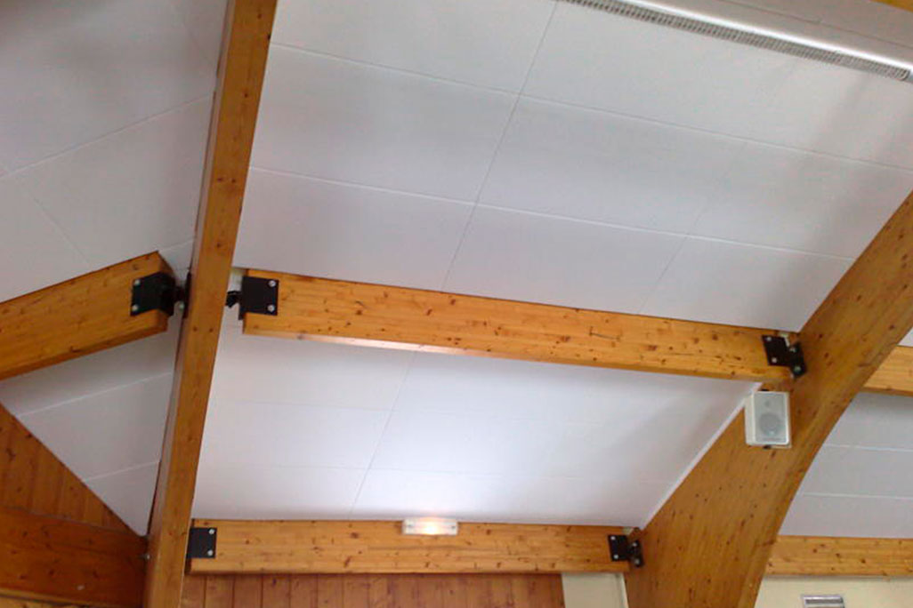 Die Anbringung von weißen soni PROTECT Schallabsorbern an der Dachschräge und hellgrauen soni PROTECT Akustikplatten im oberen Bereich der Seitenwand sorgt nun für eine ausreichende Schallabsorption und dadurch für eine Verminderung der Halligkeit im Vereinsheim. Brandschutzbestimmungen wurden eingehalten.