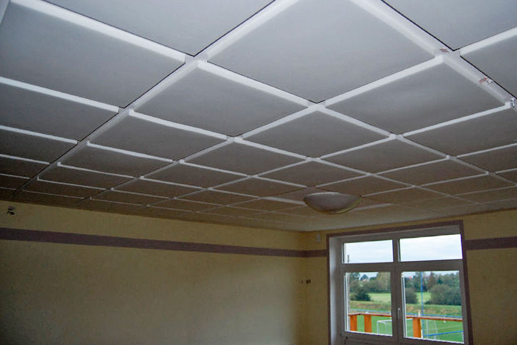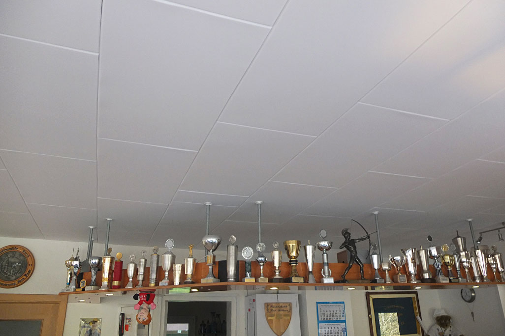 Da unser Vereinsheim auch für Feiern und Feste vermietet wird, war es dringend nötig, für Schallschutz zu sorgen, der die erforderlichen Brandschutzbestimmungen erfüllt. Durch die Raumhöhe, die harten Fliesenböden und die großen Fensterflächen war der Raum sehr hallig. Besonders bei Veranstaltungen mit vielen Personen war der Schallpegel unangenehm hoch.