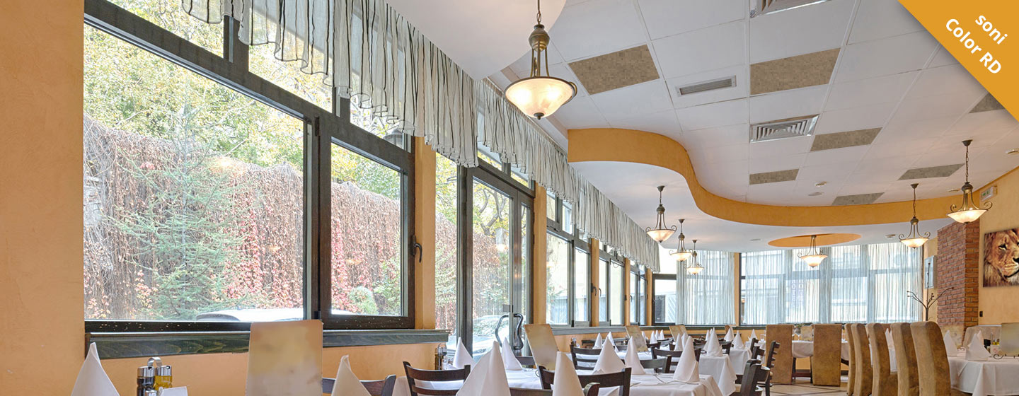 Die Anbringung von schallabsorbierenden Akustikplatten soni PROTECT F 50 mm weiß an der Decke senkte den Lärmpegel auf ein angenehmes Maß. soni PROTECT F sind gemäß DIN 4102, geprüft nach B1 klassifiziert als schwer entflammbar, Somit konnte die Raumakustik unter Einhaltung der Brandschutzbestimmungen verbessert werden.