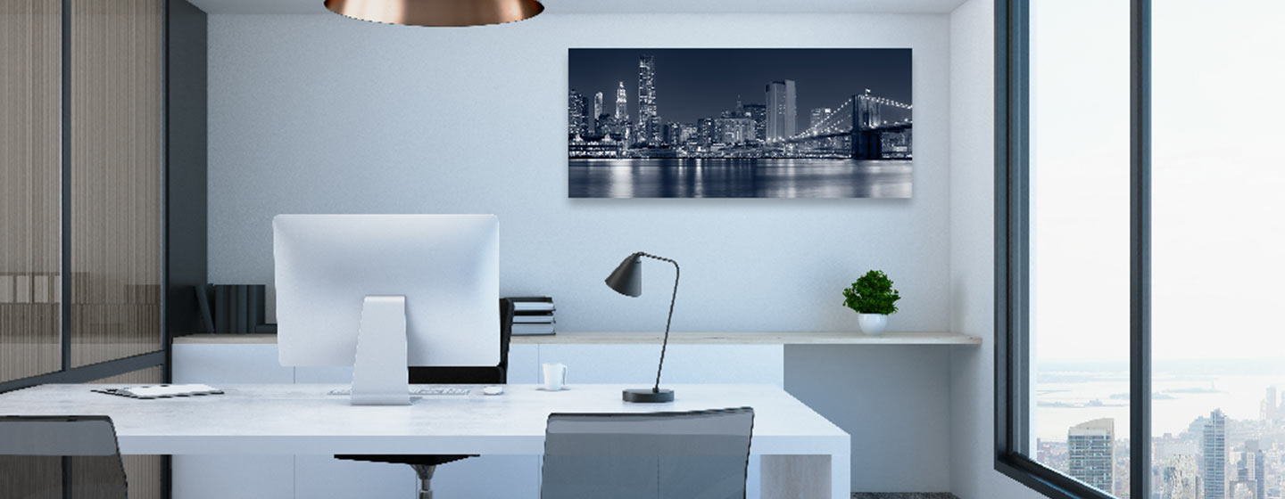 Der umlaufende Aluminiumrahmen hat eine Bautiefe von 40 mm und lässt sich mittels vormontierter Aufhängehaken einfach an der Wand befestigen. Die Rahmen haben eine Größe von 1000 x 500 mm und werden damit an jeder Wand zu einem echten Highlight.