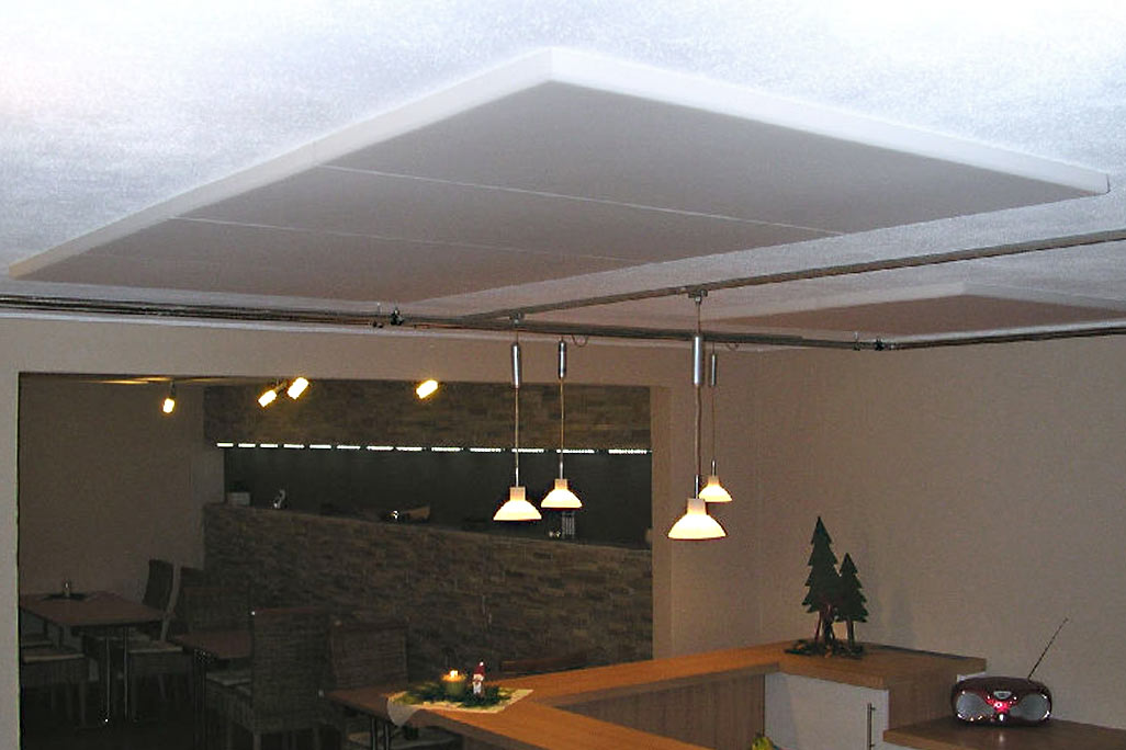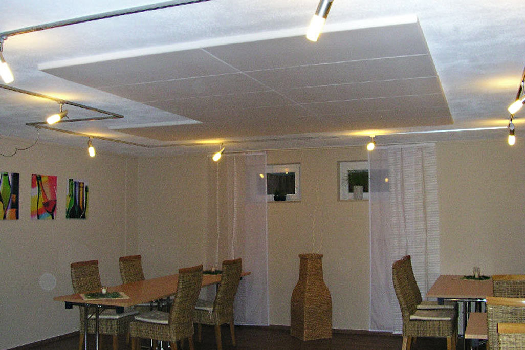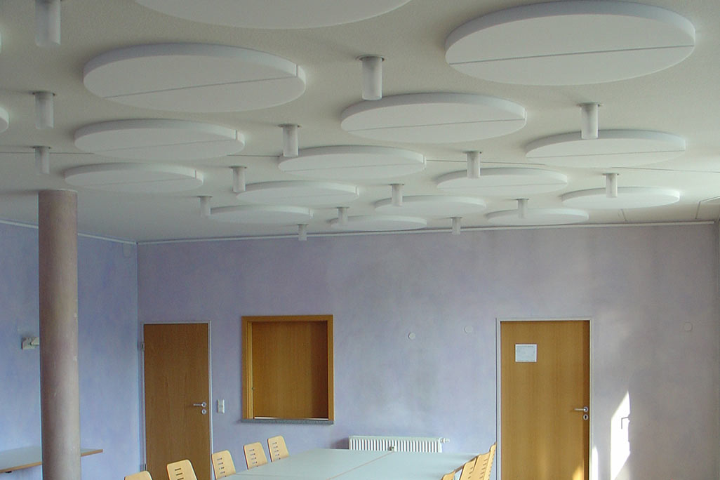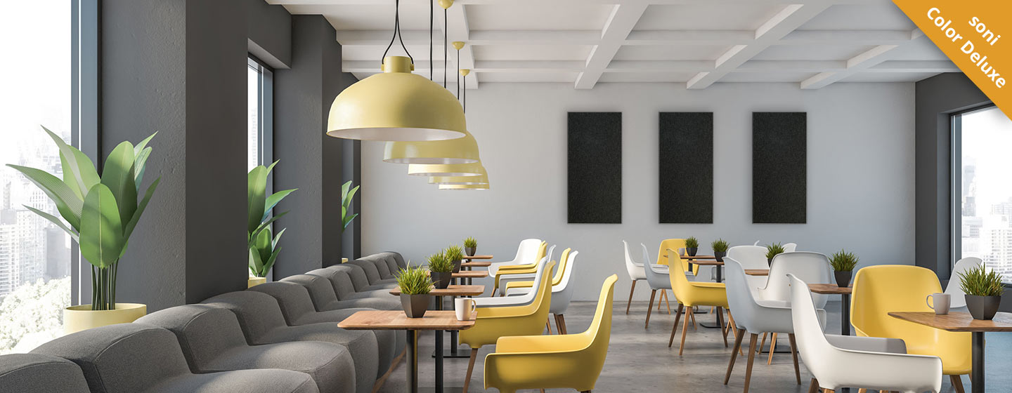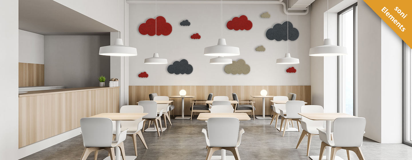 Om de ruimte-akoestiek te verbeteren, raden we aan om het plafond en de wanden te bekleden met geluidsabsorberende, geluidsisolerende materialen. Onze decoratieve en goed ontworpen akoestische elementen verbeteren uw ruimtes niet alleen akoestisch, maar overtuigen ook door hun aantrekkelijke uitstraling. Als extra ondersteunende maatregel kunnen ook geluidsabsorbers onder de tafels en stoelen worden aangebracht, om geluid te verminderen.