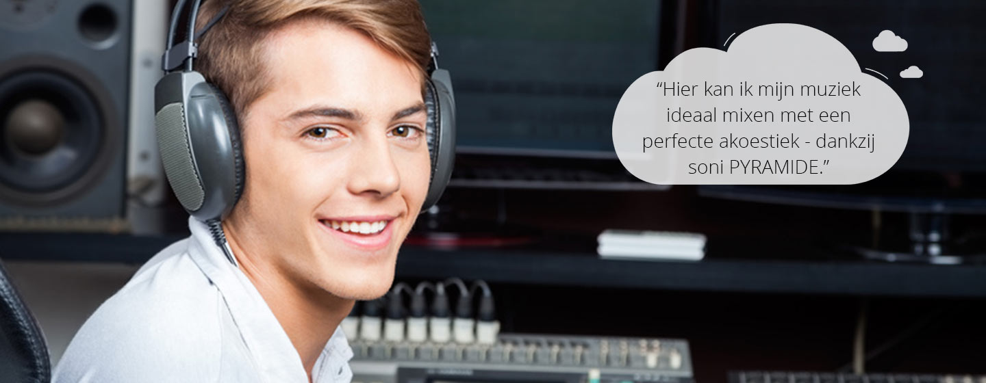 Om het best mogelijke resultaat te bereiken, raden we een "room-in-room-oplossing" aan. Hierbij wordt in de ruimte een verdere wandconstructie voor de geluidsisolatie aangebracht en deze wordt bekleed met een bijzonder effectief geluidsabsorberend materiaal. Door deze maatregel wordt de geluidsoverdracht naar buiten verminderd en wordt er in de studio voor een storingsvrije en ideale opnamesfeer gezorgd. We raden u aan om soni COMPOSITE te gebruiken, een breedbandabsorber die zowel geluidsabsorberende als geluidsdempende eigenschappen heeft en daardoor een zeer goed resultaat bereikt.